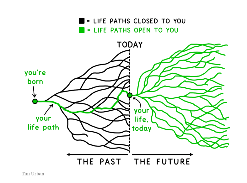 I was intrigued by this image is from a 2022 article in the New York Times[1]where author Tim Urban discusses how we use time and how we might consider our futures. At any point in our lives, we have arrived a place which is the result of multiple narrowing paths. We went to art school, instead of medical school. Or we didn’t apply for that promotion and instead changed jobs. Or we chose one partner over the other. On and on it goes. Each of these decisions leads to other opportunities; you foreclose on some possible opportunities at every turn. We can’t all the lives we might have lived. The only paths closed to us are the ones in the past.
