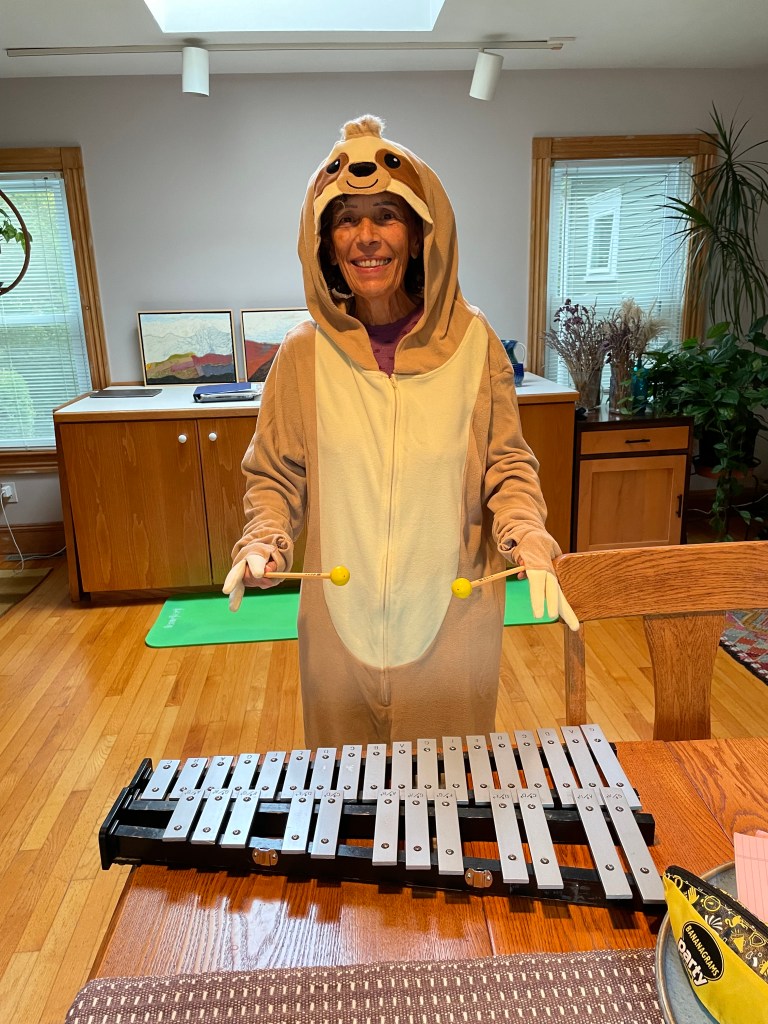 So, I started a new business that’s been a wonderful gift with some big fails. I took improv classes and been on the stage with a talented group of actors. I enrolled in a poetry class, my very first foray into writing poetry and sharing it with others. I joined a community band where I was not only assigned instruments, I’d never played but just had my debut as a mallet percussionist (Glockenspiel and timpani) in costume. In the photo, I am dressed like a sloth because I really am not only the slowest person in the orchestra but also the least experienced, having never in a band before and very new to reading music. In every one of instances, people have been kind and welcoming; I have made new friends; I have learned new skills that I thought were out of reach and have a new sense of possibility and joy. This all in the context of a challenging personal year with the deaths of several people I was close to.