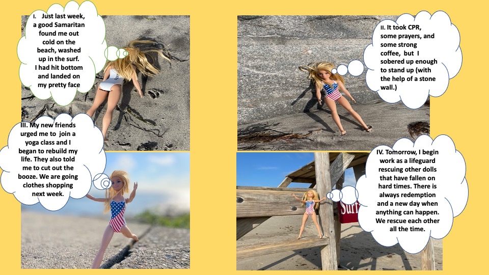I took this series of photographs after finding this Barbie-like doll washed up in the surf at high tide. She was lying face down in the sand. I picked up and looked about for a little girl who made have left her but the beach was abandoned by then. I took her home, washed her up and put her to bed. I took her back to the beach the next day to take some more photographs, trying to tell a story of this girl who fell on hard times and was saved by some friends. I posed her on the lifeguard chair just after sunrise. This chair is usually populated by two young female lifeguards and thinking they could use some company, I left her with them.